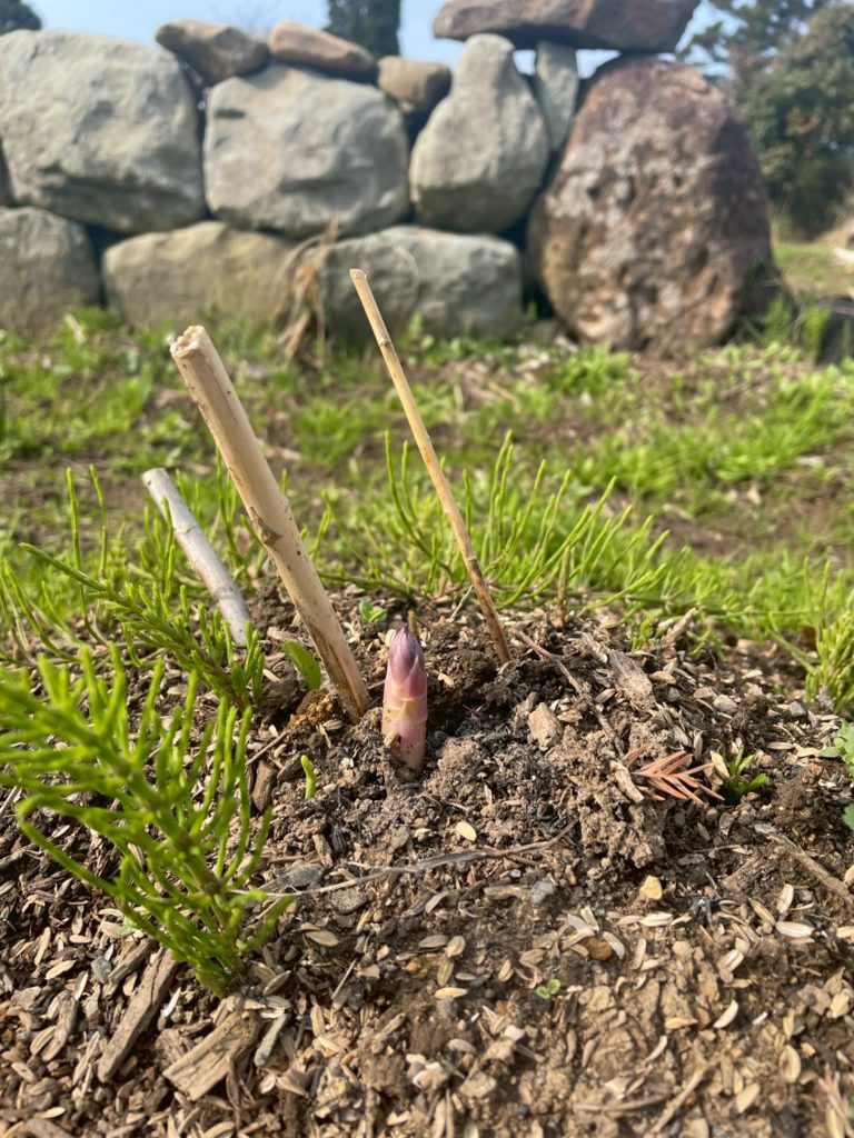 ついに顔をだしたアスパラの頭。待ってました!